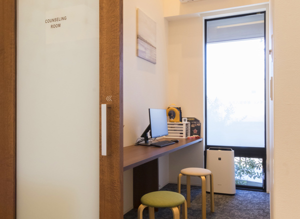 周りの目を気にすることなく落ち着いてお話できるカウンセリングルームです。清潔が保たれ、ゆったりとした空間です。